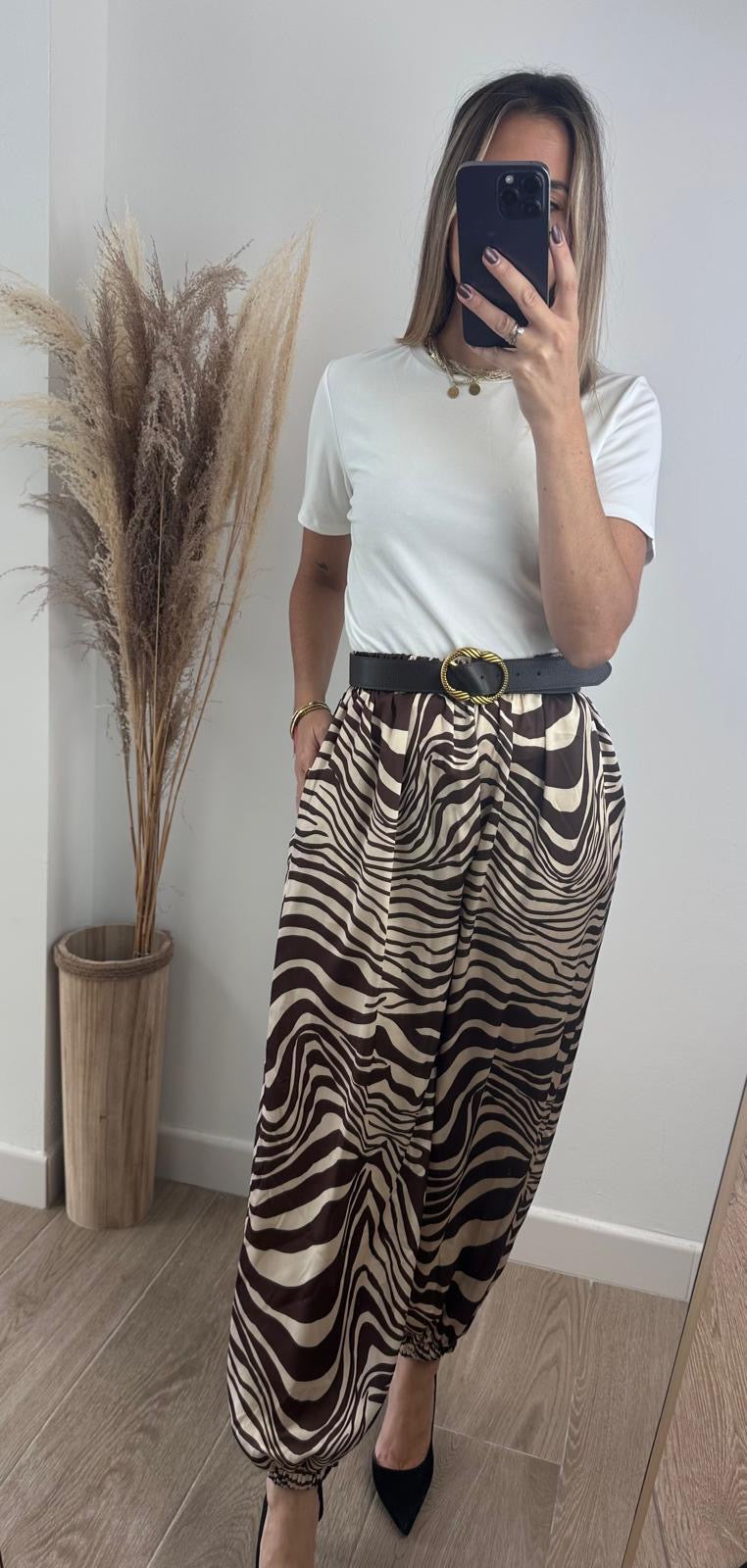El pantalón satinado es una prenda elegante y cómoda gracias a su tejido elástico y suave. Su diseño con puño agrega un toque de estilo a cualquier outfit. Perfecto para un look sofisticado y moderno.